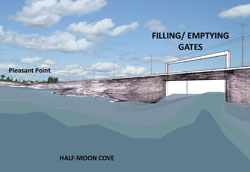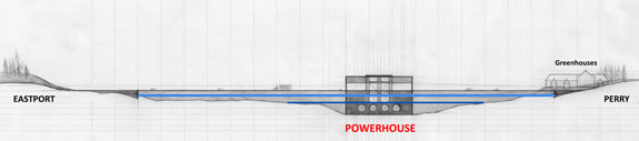 In April 2007, the Federal Energy Regulatory Commission (FERC) awarded a three year preliminary permit to Tidewalker Associates from Trescott, Maine to study the feasibility of tidal power development in Cobsook Bay. The entrance to Half-Moon Cove which borders Perry and Eastport (Maine) is the focus of this interest due to its narrow and relatively deep cross-section which would enable the harnessing of the tides for the production of electricity. In this case, the investigation will concentrate on the construction of a barrage (dam) to maximize production by utilizing tidal exchanges which average 18 feet during a typical lunar cycle. Tidewalker Associates will also investigate the use of current driven (or hydro-kinetic) devices as a secondary / supplementary and less effective manner for tapping the energy resources of downeast Maine.